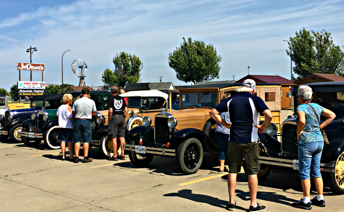 A closeup of a Model A with the JoDeans sign in the background.