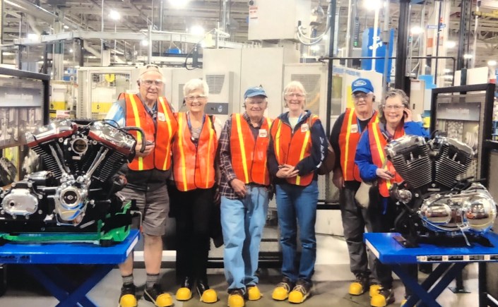 The Model A Touring Club left our hotel in West Allis, Wisconsin, this morning to take a ‘Steel Toe Tour” of the Harley-Davidson Factory in Menomonee Falls, WI. Our MATC tour group got split into 4 smaller groups for an up-close view of the assembly lines, powder coating, and machining.