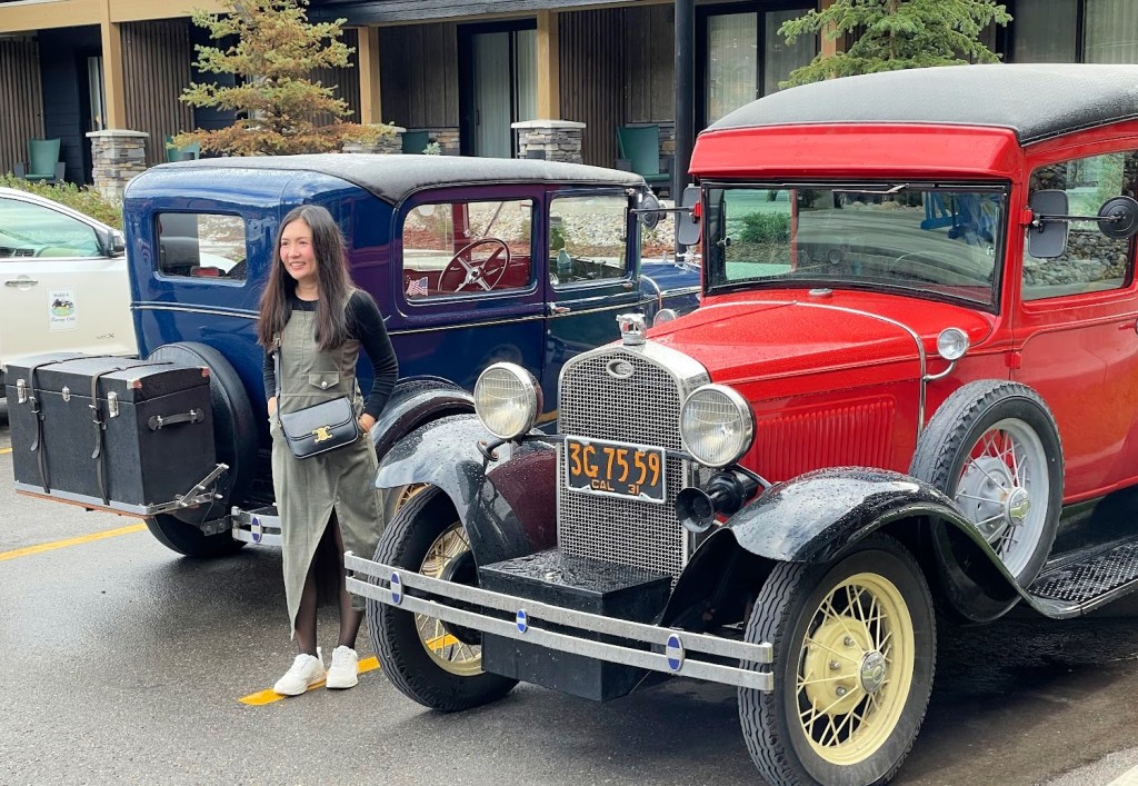 Along the way we have shared our cars and details of our adventures with onlookers, fellow tourists, and fellow car-enthusiasts. We met people from all over the world who were interested in our vintage gems. The woman you see posing in the photo below was visiting Jasper from Thailand. She and the members of her family took turns posing in front of our cars.